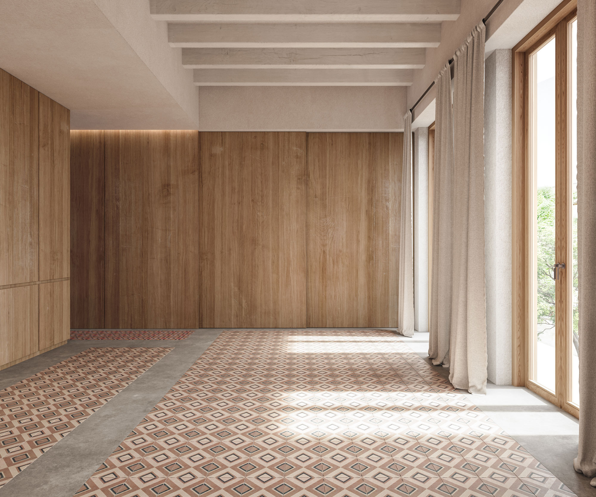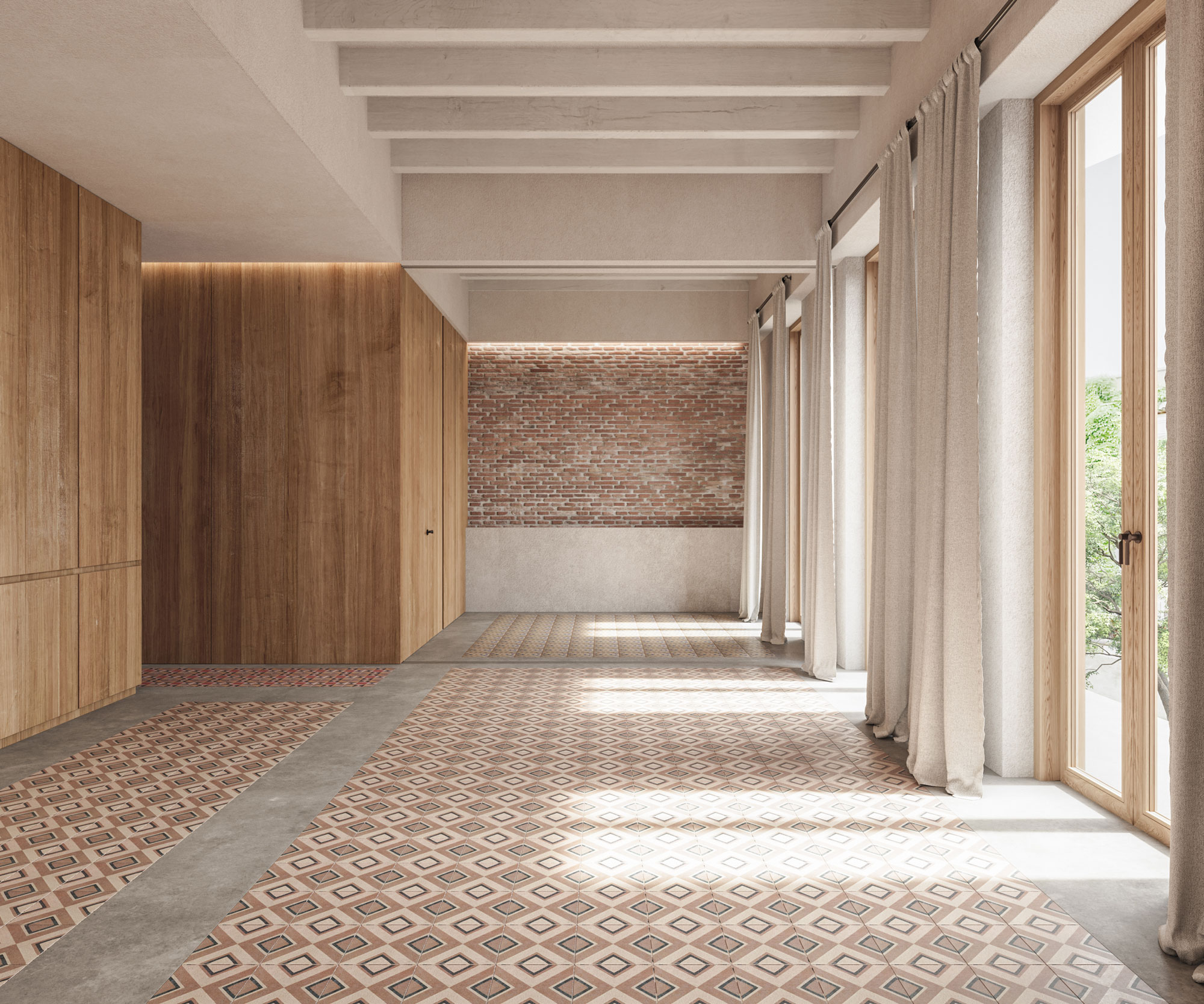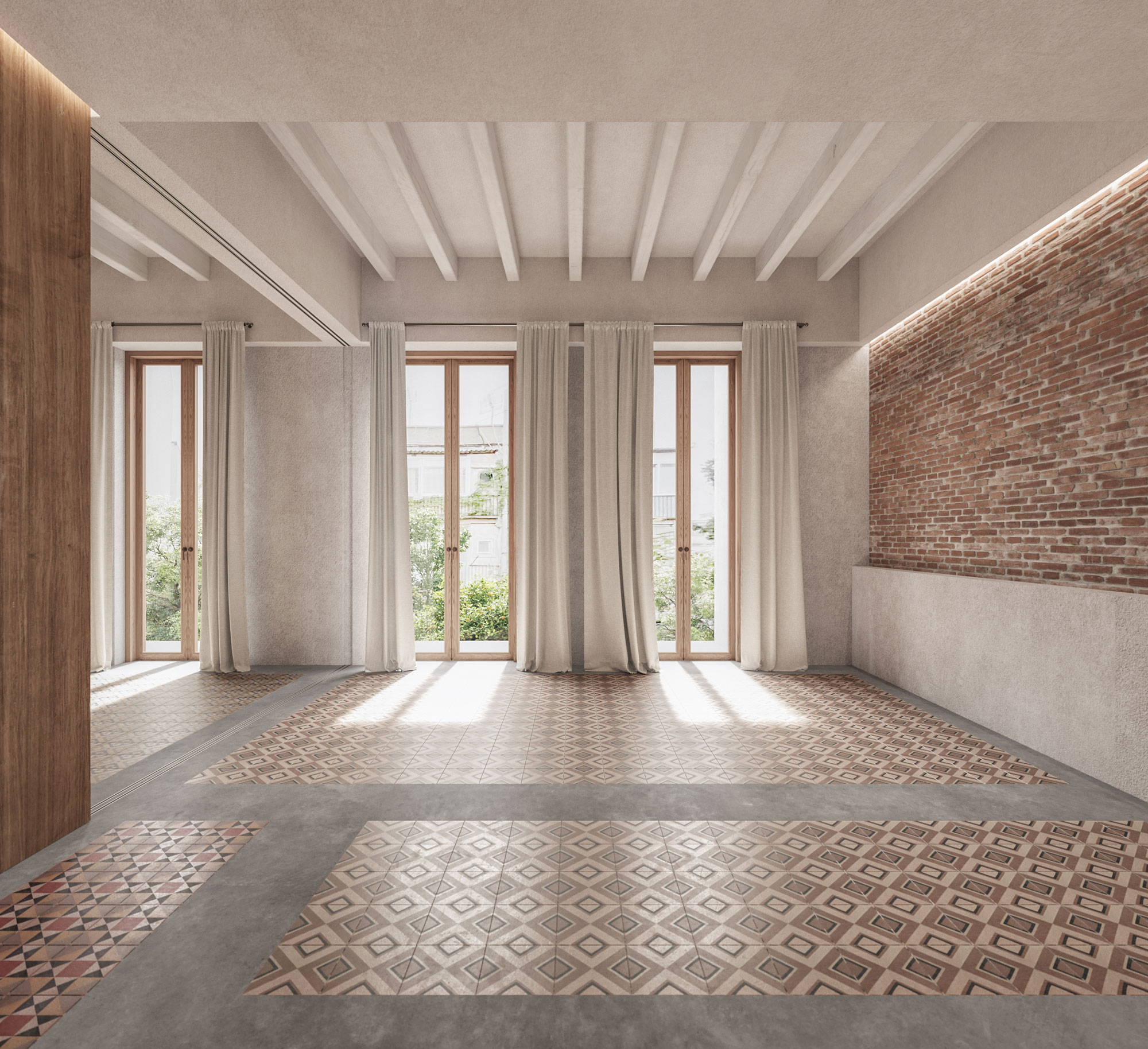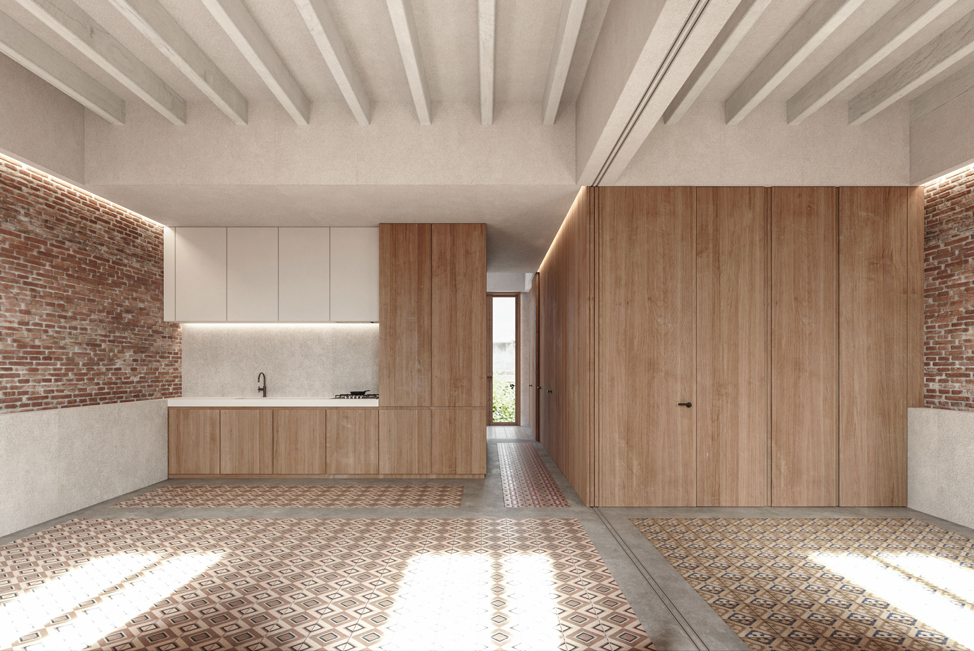 The Sarrià flat that Mrs. Juanita lived in for many years is now a modern apartment that maintains echoes of the past, such as the original restored enclosures and in which the original brick walls of the partition walls are discovered. The rigid and traditional historical configuration gives way to a new home, which reconfigures the entire day area with a flexible living room that allows a third double bedroom to be fitted thanks to the replacement of a load-bearing wall and a large invisible sliding door that is embedded in the wall.